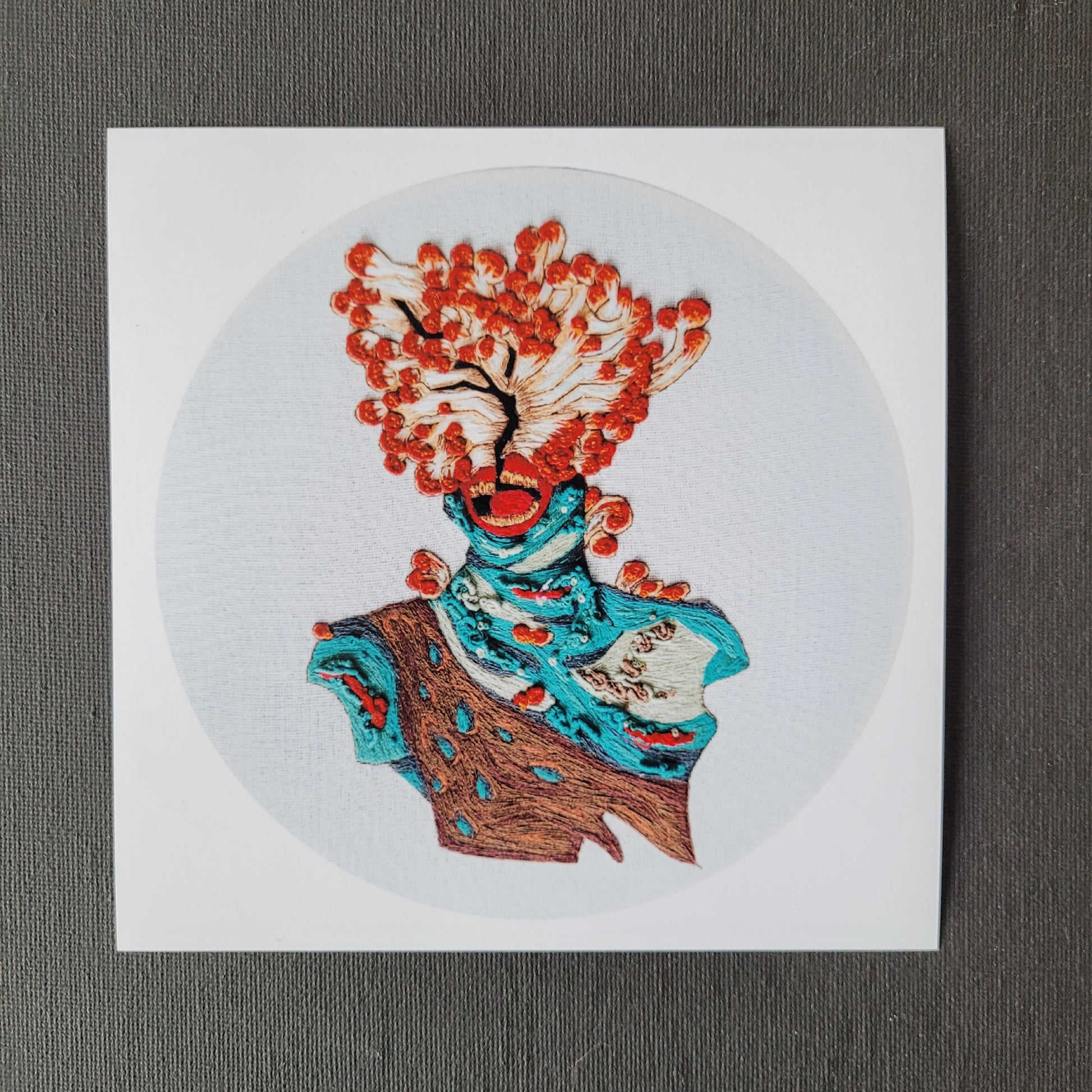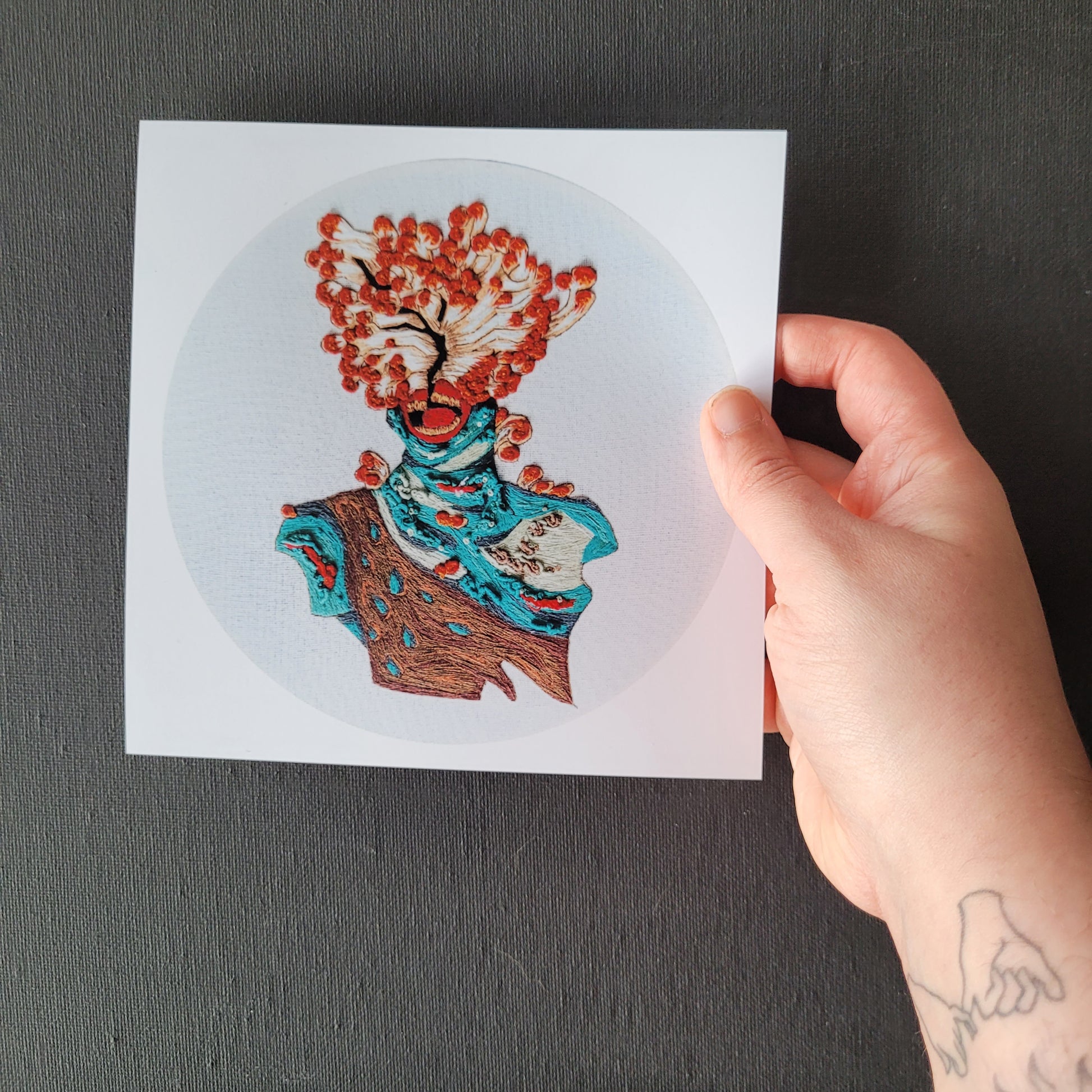 This unframed matte 6x6 square print is of my hand embroidered Clicker piece. Originally embroidered on a hoop, this print is photographed digitally, edited for clarity, and printed for a visually stunning micro piece fit for any embroidery art lover.