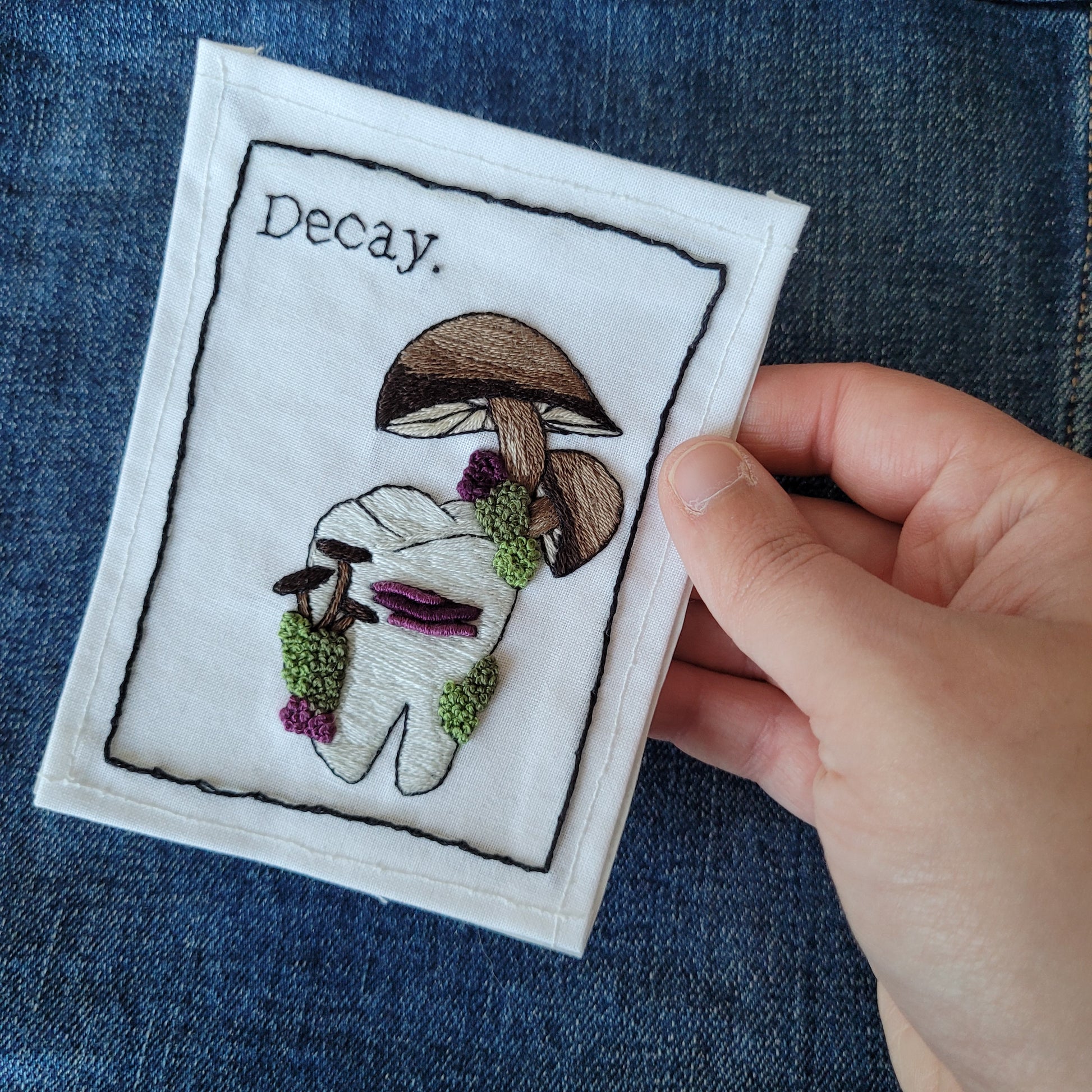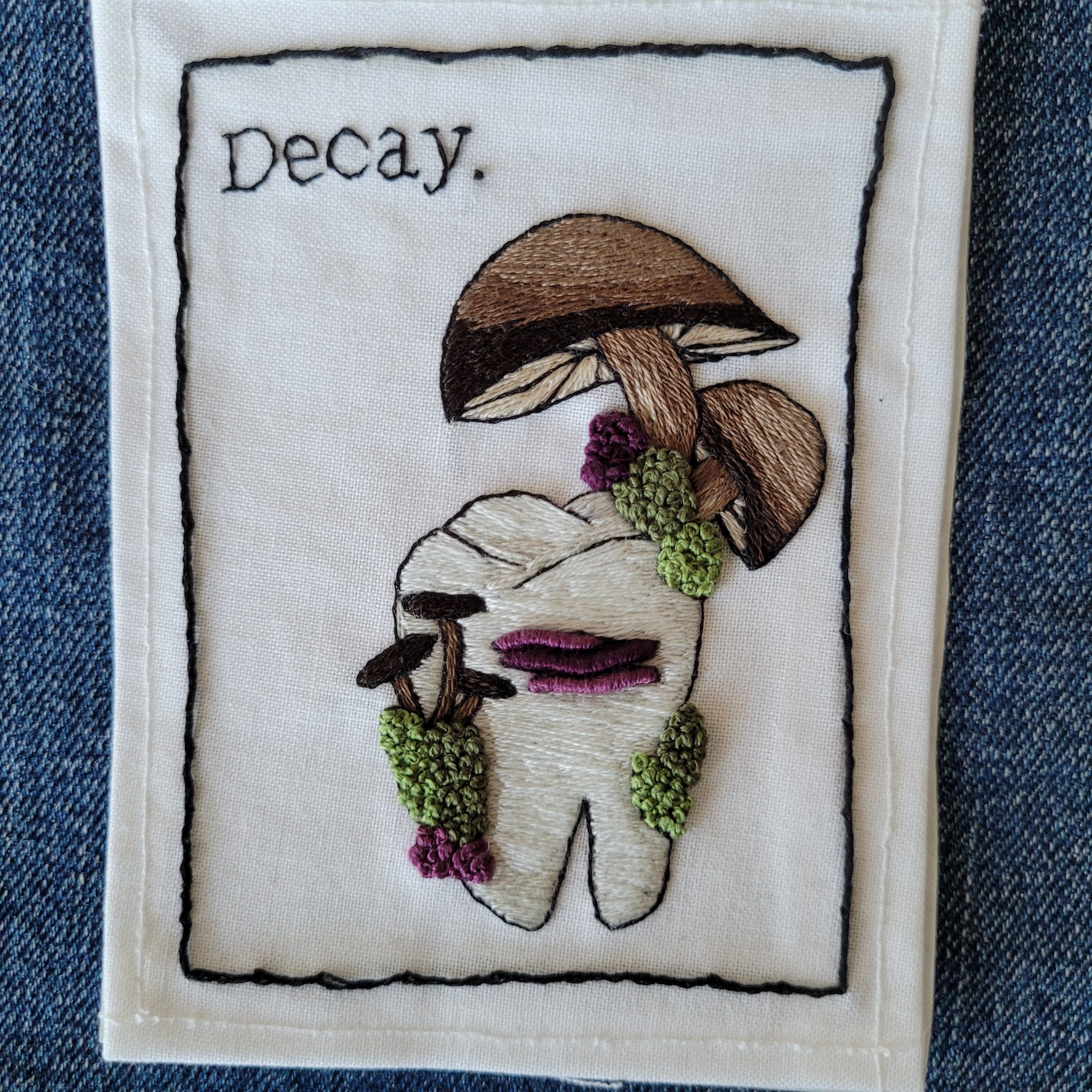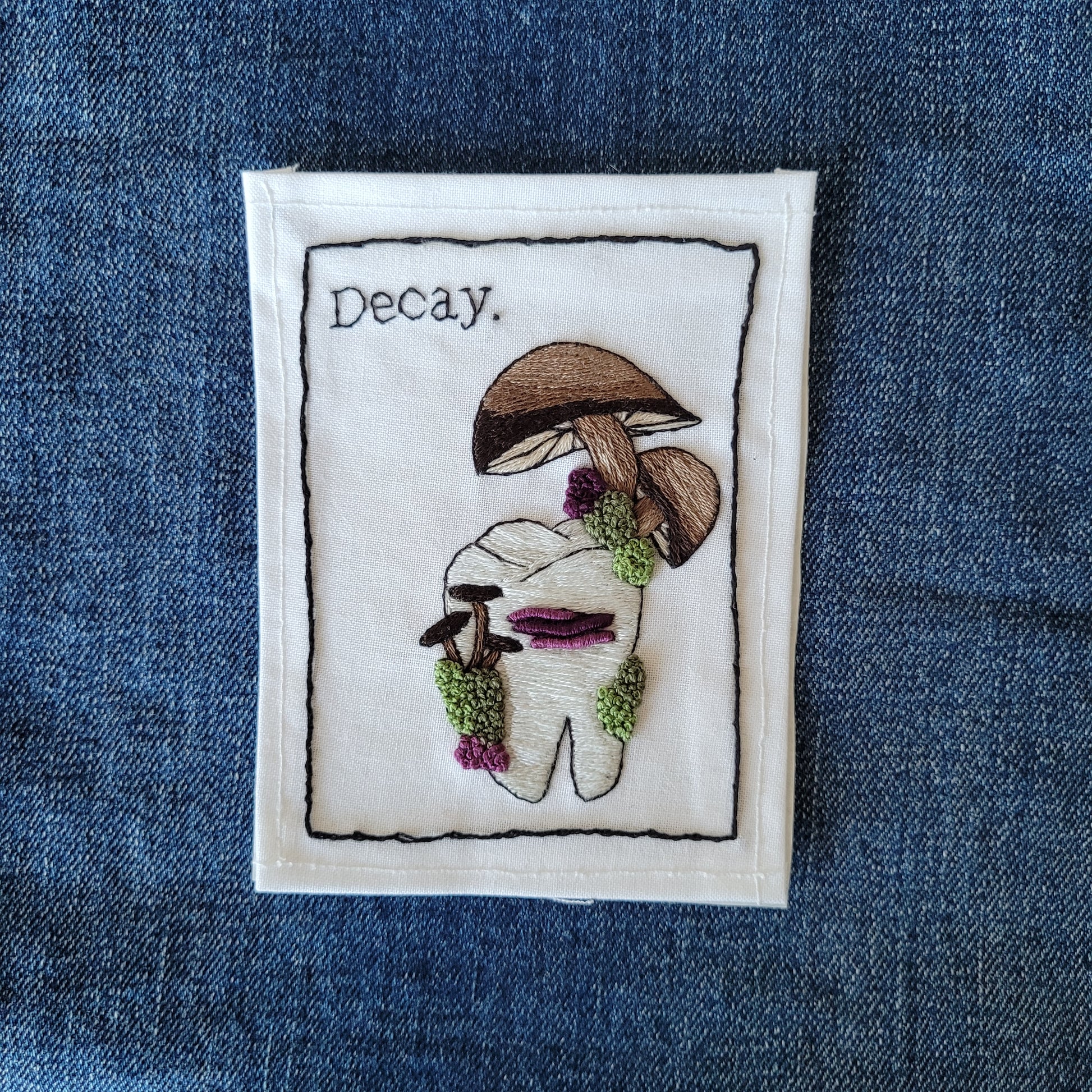 It is designed and hand stitched by me on off white cotton fabric. The backing used is Heat-n-Bond ultra-hold. Once the paper back is removed you can iron on this patch to a flat article of clothing. It is recommended that even with ironing you add a few stitches to keep the patch in place (ultra hold may degrade over time).